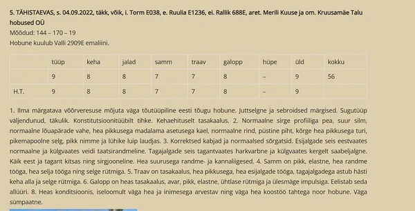 Osales 2024. a EHKASi täkkude aastanäitusel, kus kohtunikud kiitsid tema avarat liikumist, tasakaalu ja hüpet. Tunnustatud kolmeks aastaks.