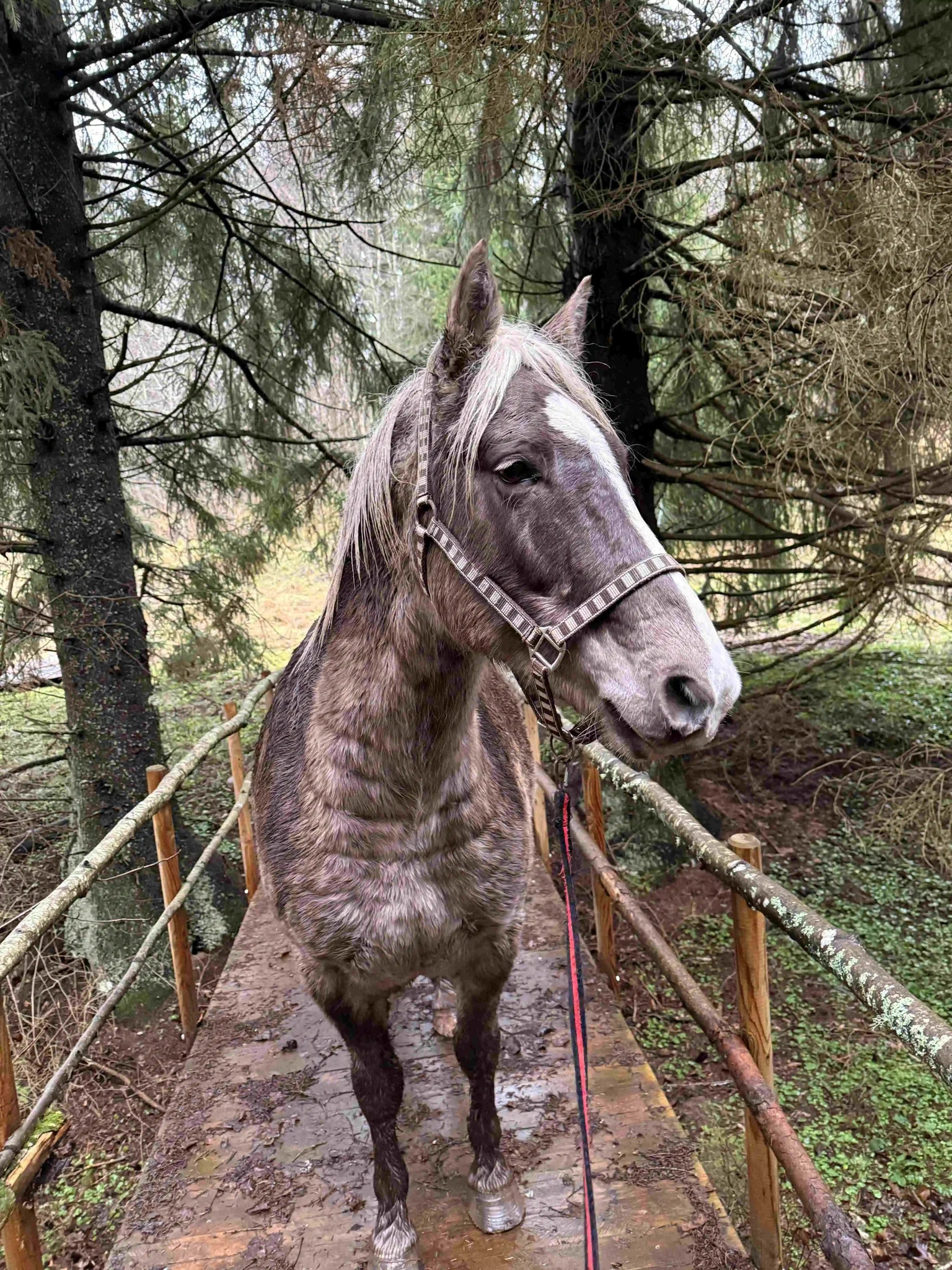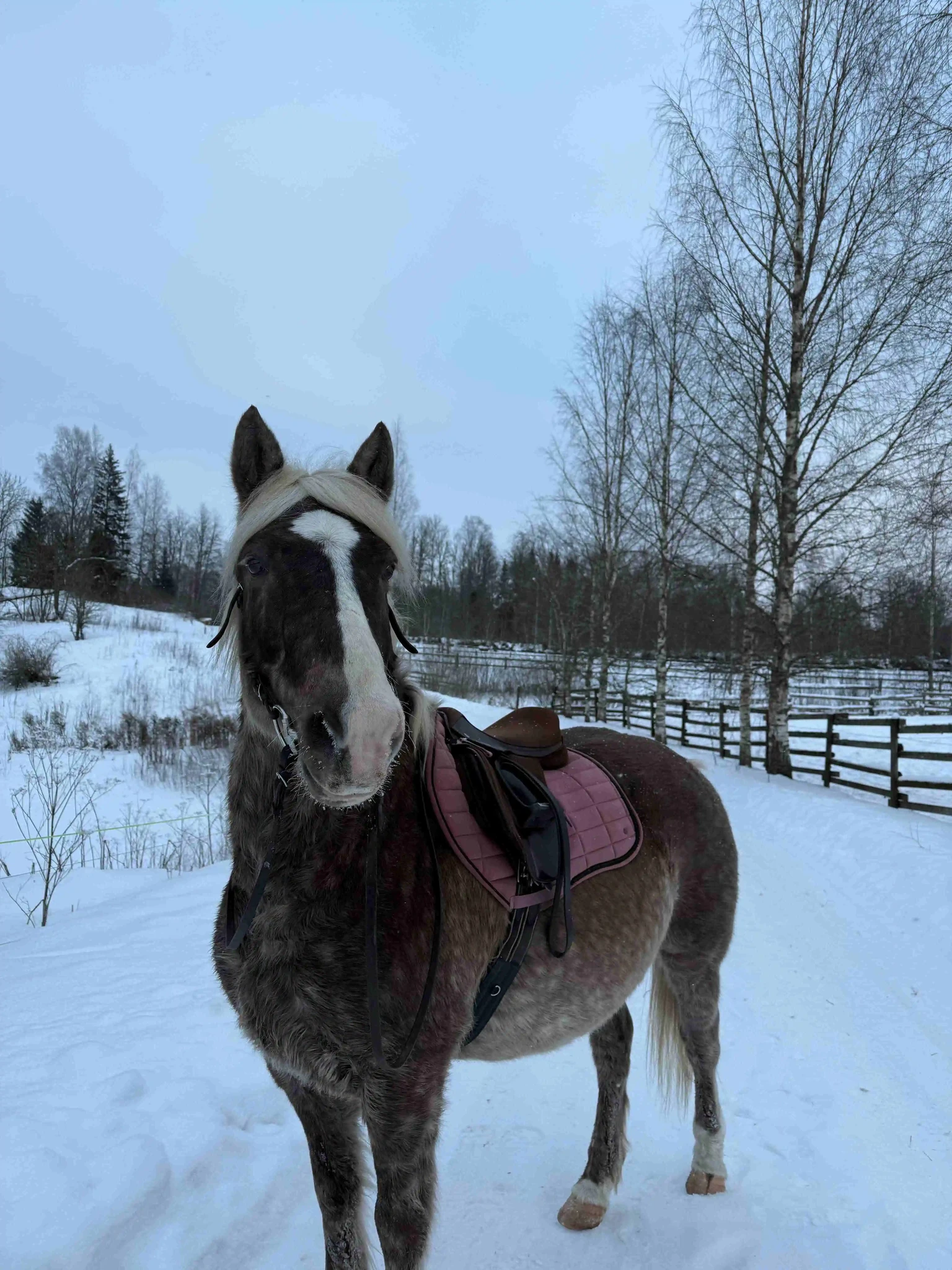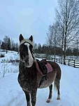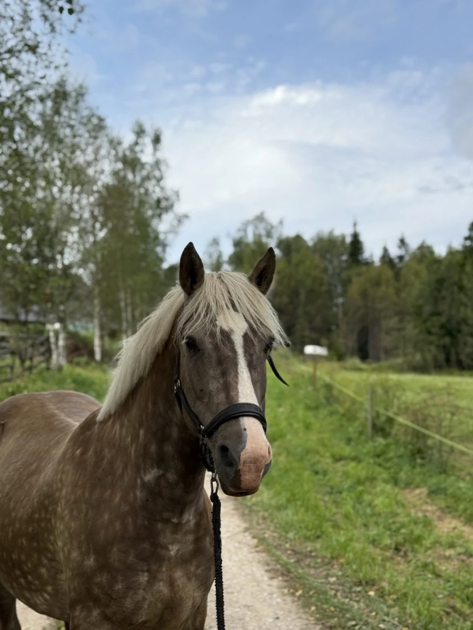 Has lived in his birth home his entire life, so his full history is known. At home he has happily jumped, practiced basic dressage, and even pulled a sled for children’s fun. Extremely comfortable and enjoyable to ride – also bareback and without a bridle. Calm, well-mannered, and free from bad habits.